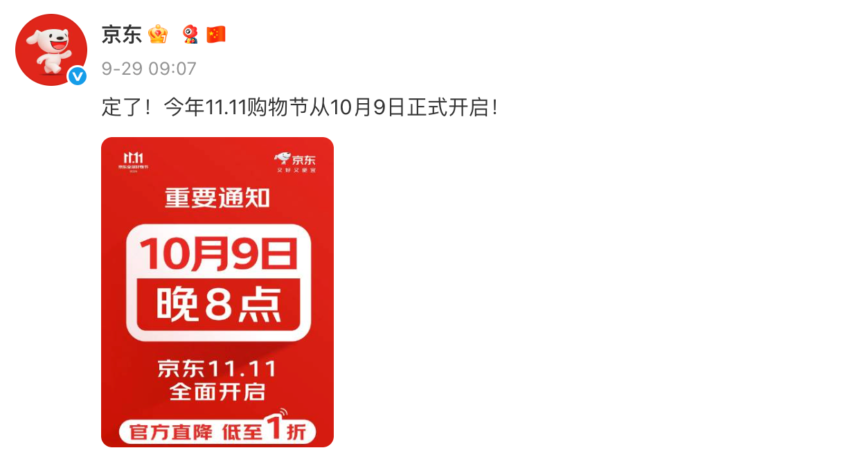更令人惊喜的是,今年的「双11购物节」再度提前。京东已宣布将于10月9日正式开启活动,这意味着国庆假期后的第一天,消费者就能享受到「国补+双11」的双重优惠。对于计划换机的用户来说,这无疑是一个绝佳的入手时机。
