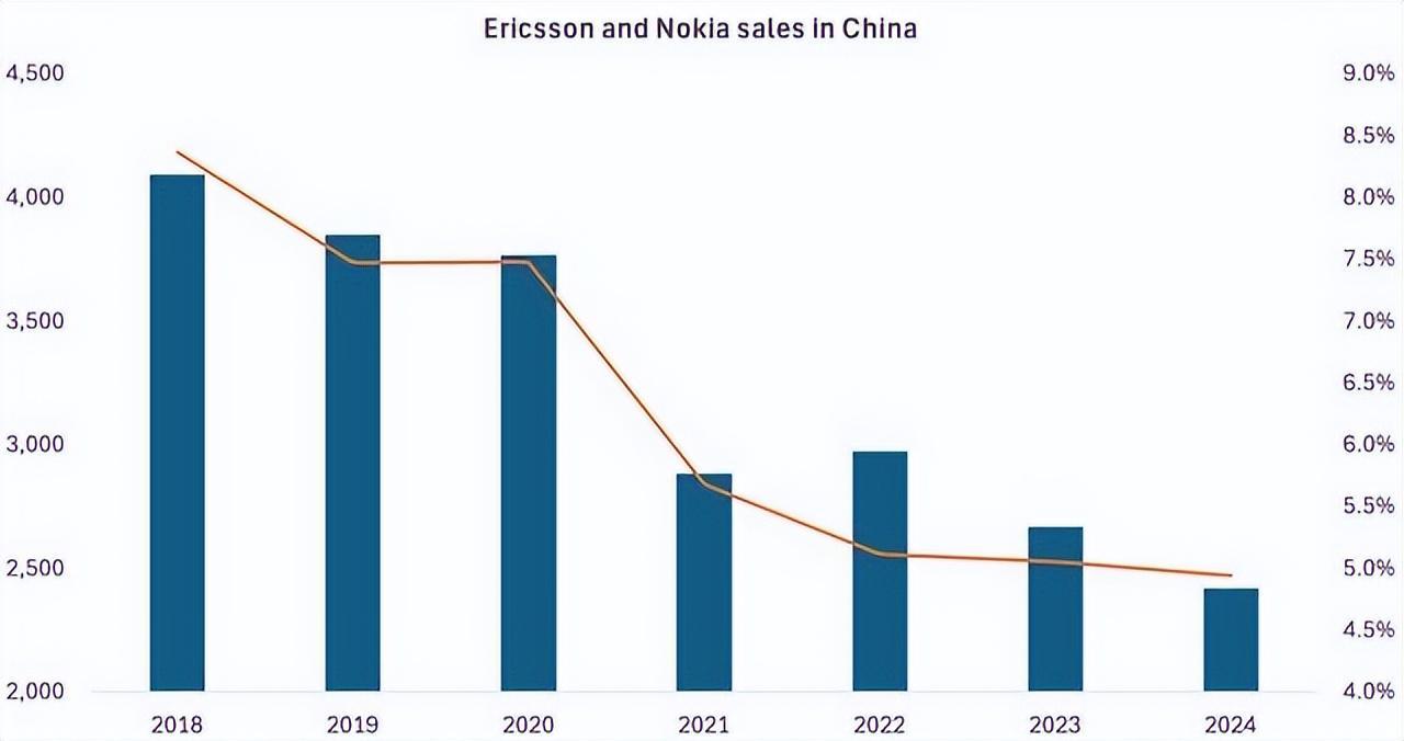 2020年10月,瑞典政府以“安全风险”为由禁止华为参与本土5G网络建设,此举直接导致中国运营商调整采购策略。2021财年,爱立信在中国市场的收入同比下滑46%,从巅峰跌入谷底。诺基亚的境遇更为严峻,其大中华区销售额从2020年的高点持续下滑,至2024年已缩减至11亿欧元,2025年上半年更同比下降23%。招标规则向本土供应商倾斜、华为中兴设备的性价比优势,以及政策导向的共同作用,使得北欧企业的市场份额加速流失。