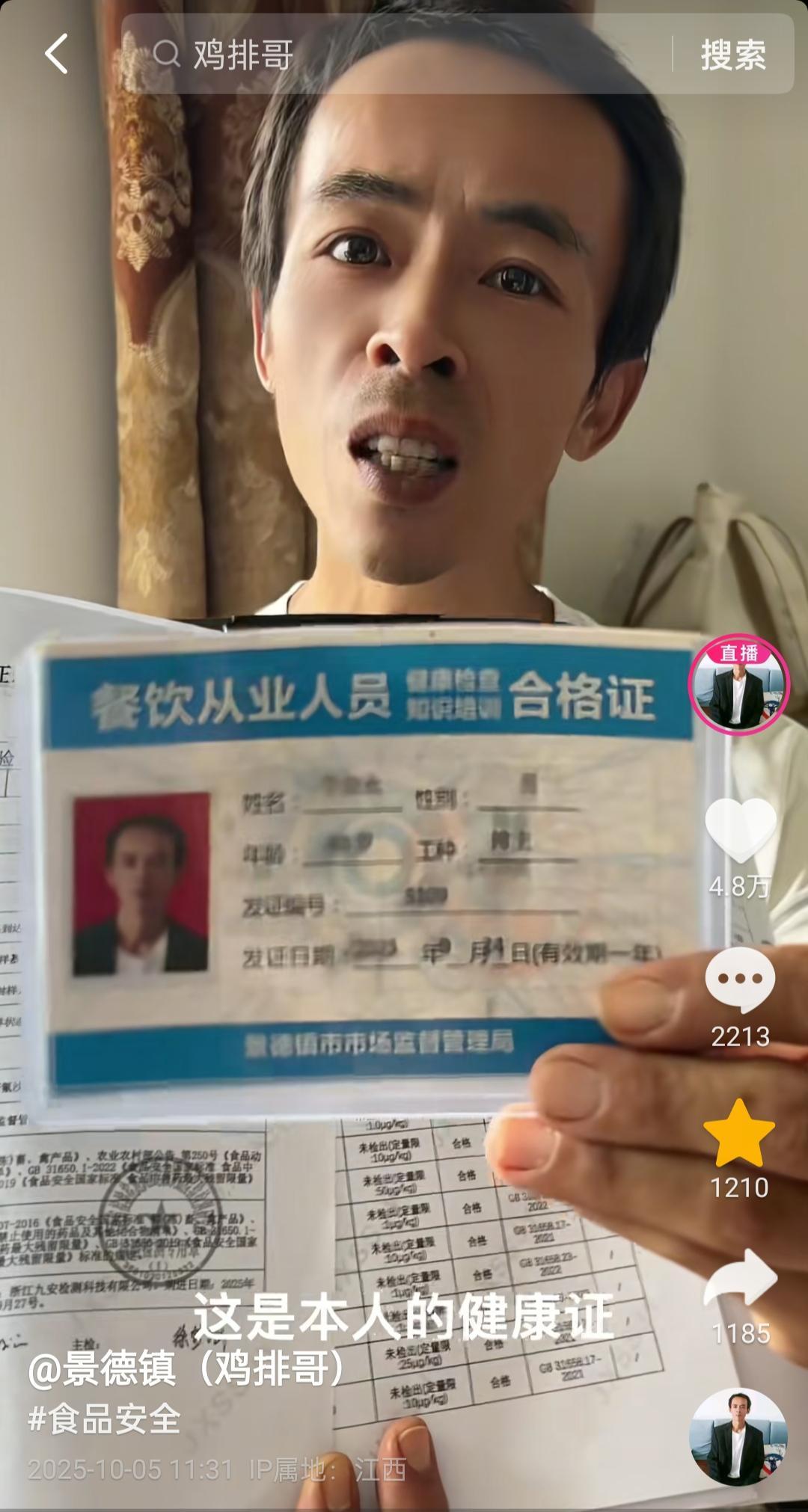除了出摊时间的澄清,“鸡排哥”还在10月5日中午通过社交媒体回应了公众对食品安全的关切。他郑重出示了多份检测报告,包括使用的生肉、炸制好的鸡排以及食用油的合格检测报告。这些报告覆盖了6个不同批次的产品,检测机构分别位于南昌和杭州两个不同城市,结果显示均合格。此外,“鸡排哥”还在镜头前展示了他的有效健康证明,进一步打消消费者的顾虑。