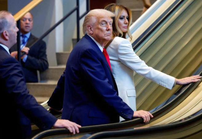 9月23日,美国总统特朗普和夫人梅拉尼娅到达联合国总部参加第80届联大会议,乘坐自动扶梯时,电梯突然停止运作。图自路透社