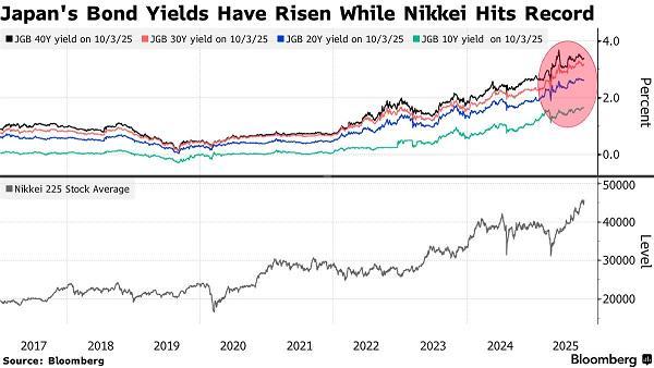 #日本市场#FX168财经报社(亚太)讯 在日本执政党自民党党首选举中,亲经济刺激政策的高市早苗(Sanae Takaichi)胜出,市场普遍预期其将成为日本下一任首相。这一结果引发了全球金融市场的剧烈波动,10月6日周一,日本股市暴涨,日元兑美元汇率跌至近九周低点,黄金和比特币价格也纷纷创下历史新高。