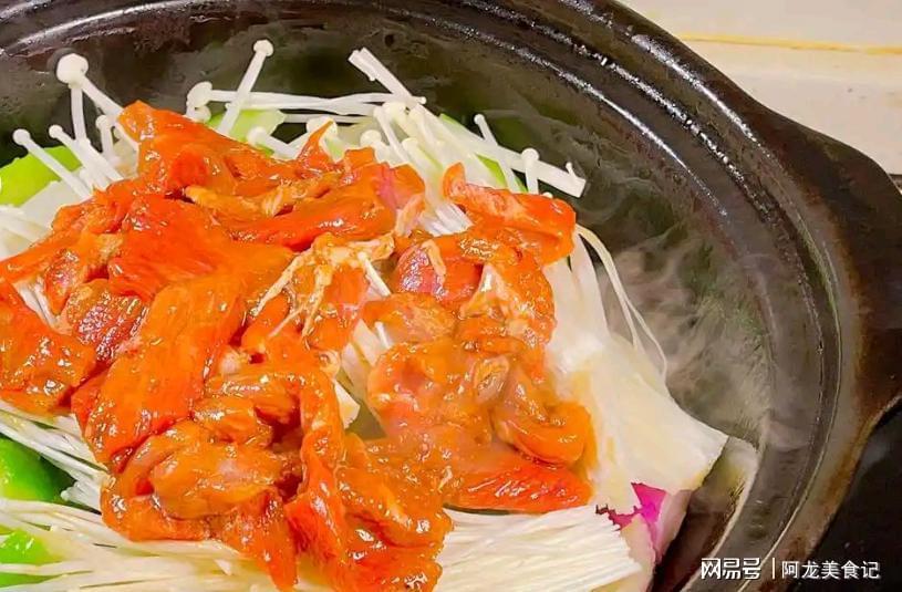 5. 分层焖煮:依次铺上金针菇、牛肉片,加热水没过食材,加盖中火焖5-6分钟。