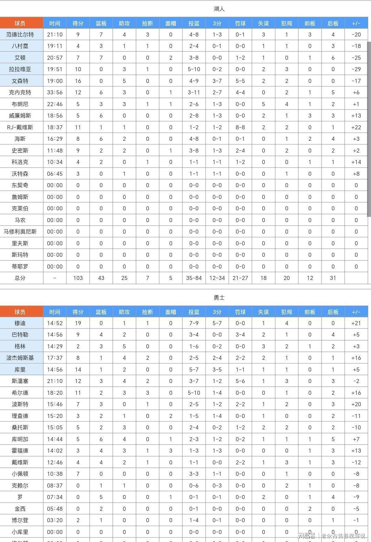 最终,勇士队以111-103取胜,送给湖人队两连败。球员表现方面,库里出战15分钟,得到14分,状态不错;巴特勒得到9分4篮板。穆迪9中7高效发挥,新援霍福德融入球队,贡献3分4篮板3助攻3封盖。文森特得到16分5助攻,范德比尔特9分7篮板4助攻3抢断,攻防都有贡献。艾顿、克内克特有所回暖,布朗尼得到5分但出现5次失误。