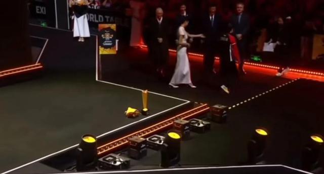 而她站的位置,更是让人哭笑不得。恰巧卡住了领导上台的通道口,这个位置说是C位,实则更像个“屏障位”。莎莎似乎并未察觉到自己的站位有何不妥,反而将奖牌和花束随手放在地上,姿态自然得就像在家门口扔钥匙一样。边上的礼仪小姑娘见状,都快急哭了,小声提醒她挪一步,生怕吓着这位“梦游冠军”。