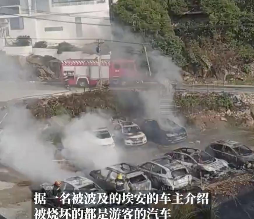 更让人揪心的是火势的蔓延速度。有游客拍摄的现场视频显示,火舌顺着风势迅速舔舐到旁边的SUV,轮胎爆裂的声音此起彼伏,短短二十分钟内,7辆车全部被卷入火海。