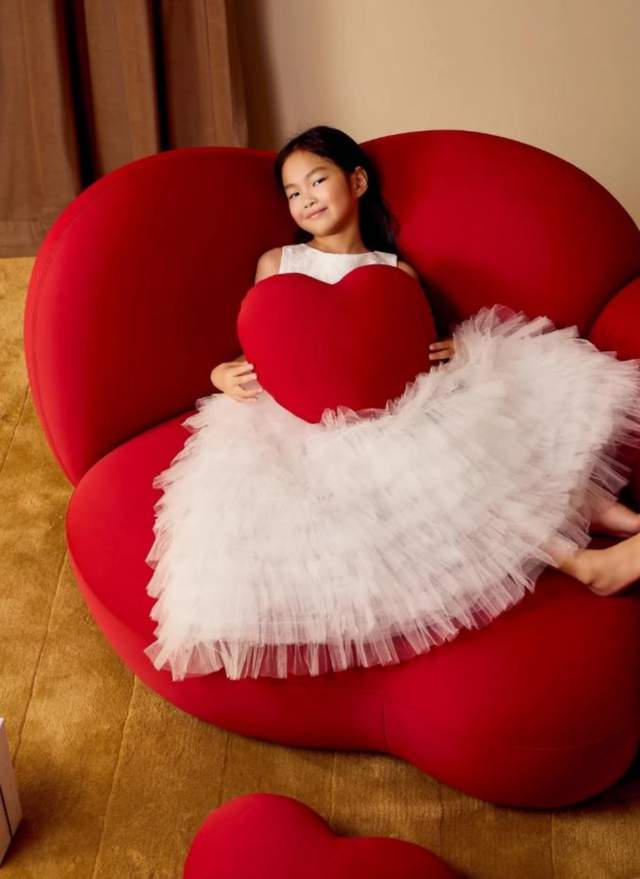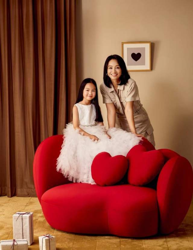 在曝光的照片中,小小丹一头长发自然披肩,身着白色公主裙,优雅地坐在红色爱心沙发上。她轻轻亲吻着妈妈朱丹的脸颊,动作既淑女又可爱。而朱丹虽然表情略显夸张,但眼中流露出的幸福却怎么也藏不住。