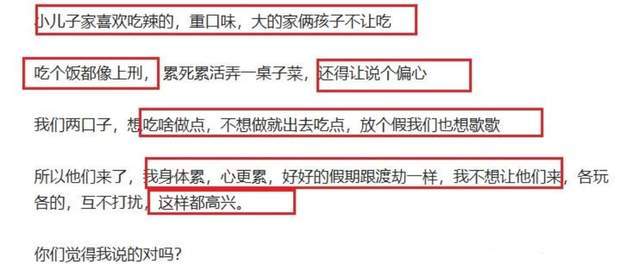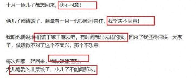 博主举例说明:大儿媳爱吃韭菜饺子,但小儿子不能闻那味;小儿子家喜欢吃辣,大儿子家孩子又不吃辣。一顿饭下来,老人累得腰酸背痛,还要被说偏心。