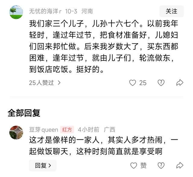 要么小辈出钱,在外就餐、聘请帮厨、预订民宿,减轻老人的家务负担;要么小辈出力,饭菜几个子女家轮流做,或者规划好‘值班表’,采买、烹饪、清洁都安排到人,让老人从繁重的劳动中解放出来,真正享受天伦之乐。