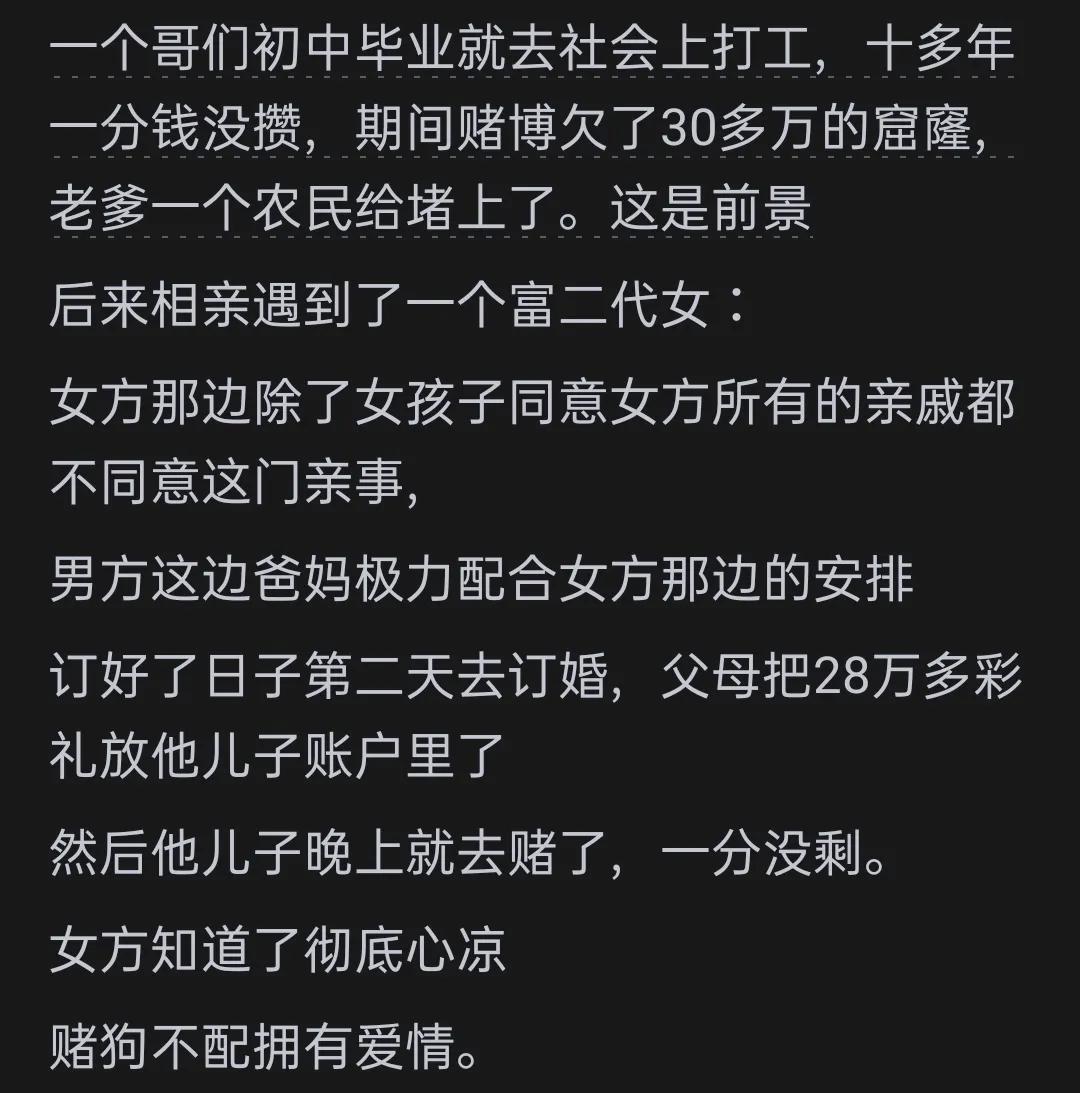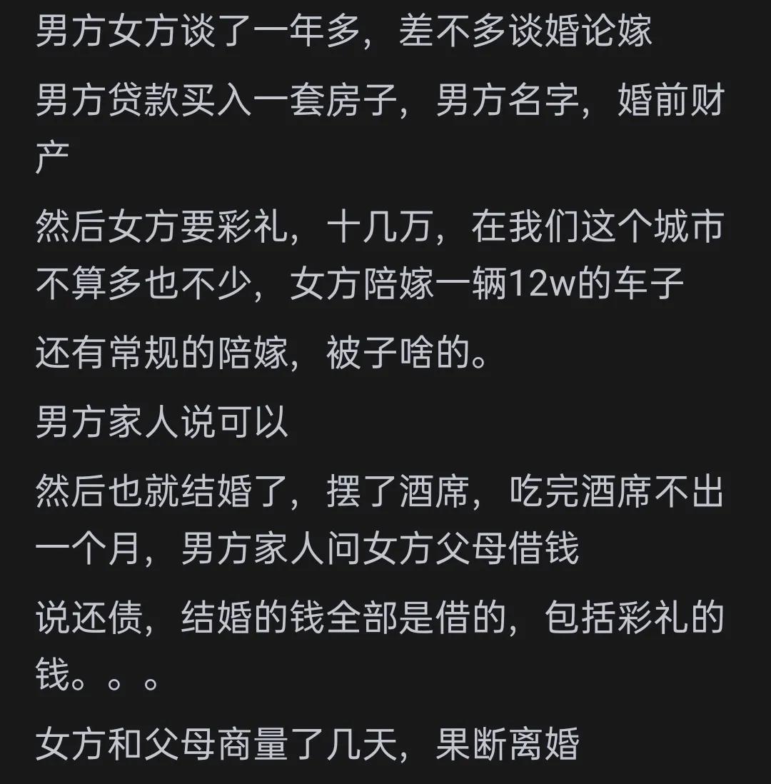 朋友圈子里还有一个真人真事。男方家条件不错,女方家较差,还有个哥哥。两人已经结婚了,男方对女方和岳父母都很好,每年除了买吃穿用度、医疗等,年底还拿不低于5万给岳父母。结果女方哥哥要买房结婚,岳父母直接提出让这男的付首付,成功把女儿女婿搞离婚。当时聊天,这男的就说,哪怕岳父母说年底的钱增加到10万,他都不至于离。他也知道这些钱给了岳父母他们也存起来给哥哥买房了,这么些年,估计也存了八九十万,他也没想过能拿一部分给他媳妇,估计这次是买房差30万,直接让他出了。他可以出,但是不能把他当傻子。