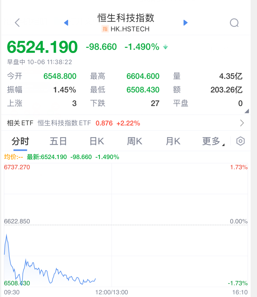 1.兄弟姐妹们好啊!今天港股正常开盘,恒生科技再次跳水下跌快2%,黄金大涨1%再创历史新高!阿里巴巴-W跌超2%,哔哩哔哩-W跌超2%,中芯国际跌近2%,新能源汽车股低迷,理想汽车-W跌超2%、小鹏汽车-W跌超1%,港股国庆节才涨了一天就连跌2天,明天港股又休市一天,基本把涨幅给干完了这是!