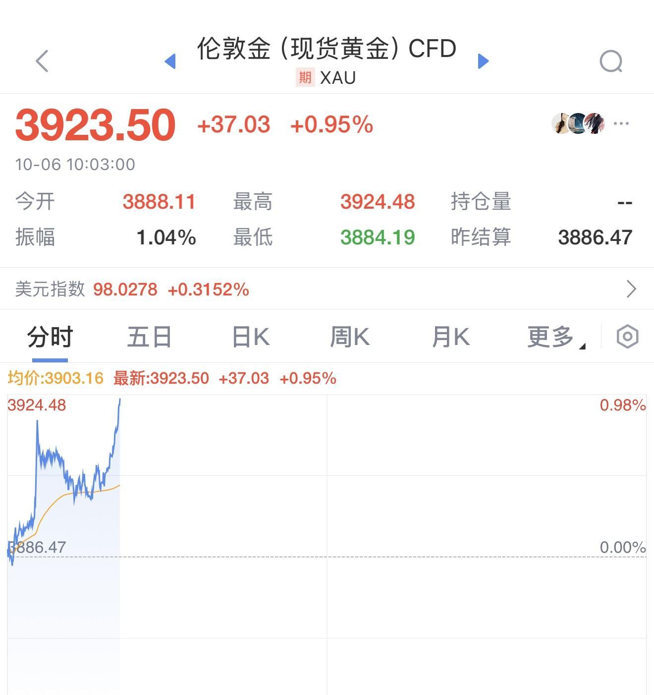 今天港股唯一就是贵金属板块全线拉涨,中国白银集团涨超18%、珠峰黄金涨超11%,潼关黄金、山东黄金涨超4%,灵宝黄金、赤峰黄金等跟涨。主要是今天国际黄金大涨1%站上3923美元,真的是太夸张了,大龙说的黄金看涨4000美元马上就到了!