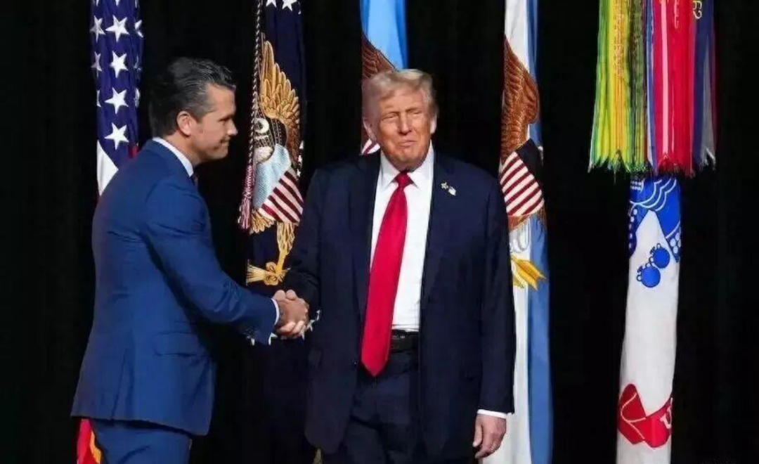 (图:特朗普在匡提科基地演讲,支持国防部长赫格塞思)