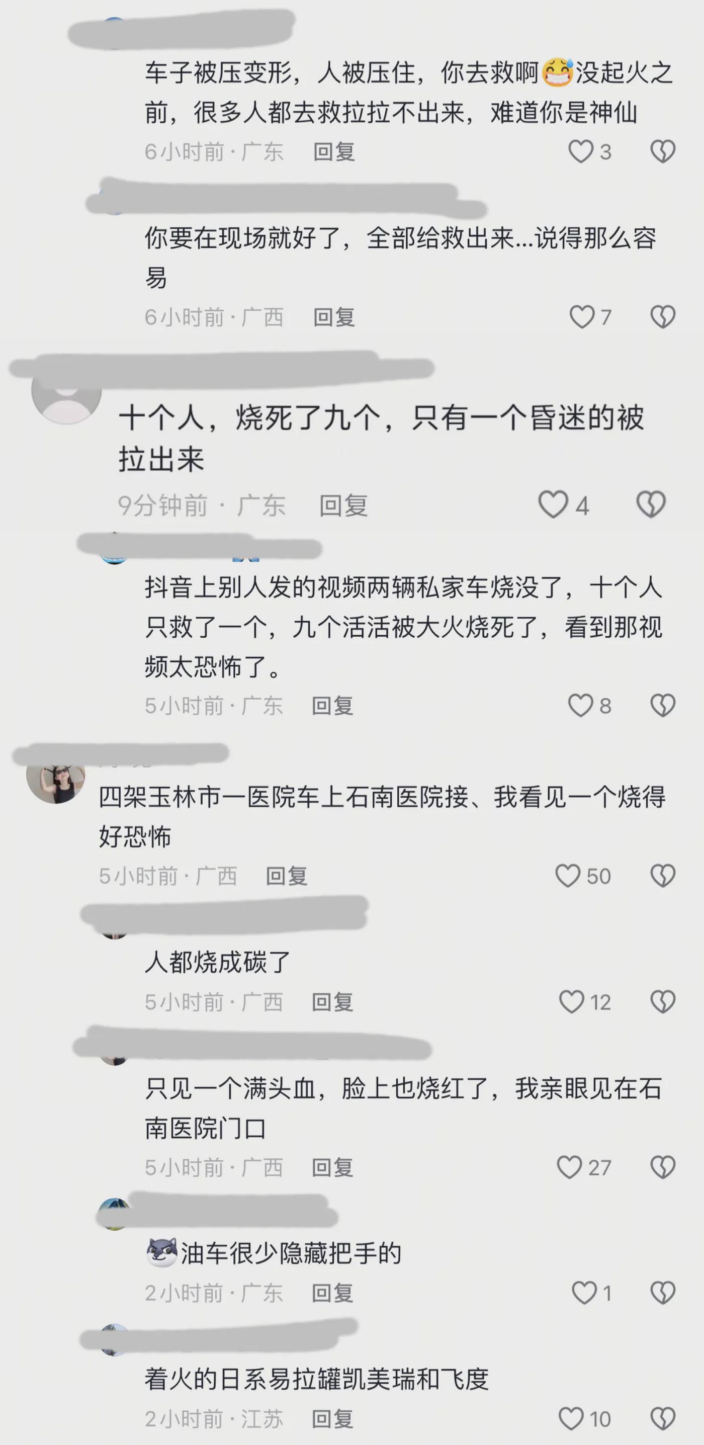一名现场目击者透露,两辆燃烧的车辆均为油车,且事发时均是满载状态,每辆车内均有5名驾乘人员,其中包括小孩。令人痛心的是,仅有一名驾乘人员成功逃离火海,其余人员均不幸被困,遭遇了“现场火化”的悲剧。