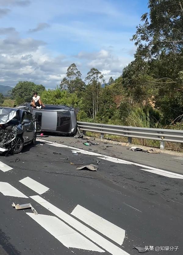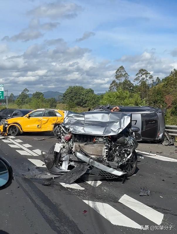 据现场目击者拍摄的画面显示,事故涉及多辆小型客车,其中一辆白色轿车车头严重变形,前保险杠完全脱落,引擎盖高高隆起。更令人揪心的是,一辆黑色SUV发生侧翻,四轮朝天停在路中央,有乘客正从车窗艰难爬出,所幸未被车辆压住。