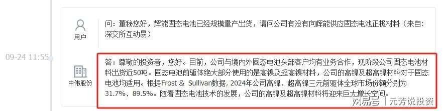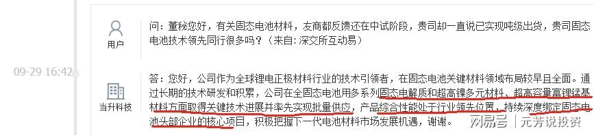 固态电池最新进展:公司在9月29日的互动平台表示,公司在全固态电池用多系列固态电解质和超高镍多元材料、超高容量富锂锰基材料方面取得关键技术进展并率先实现批量供应,产品综合性能处于行业领先位置,持续深度绑定固态电池头部企业的核心项目。