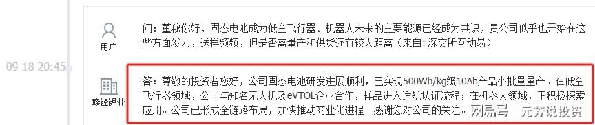 固态电池最新进展:9月18日的互动平台显示,公司固态电池研发进展顺利,已实现500Wh/kg级10Ah产品小批量量产。在低空飞行器领域,公司与知名无人机及eVTOL企业合作,样品进入适航认证流程;在机器人领域,正积极探索应用。公司已形成全链路布局,加快推动商业化进程。