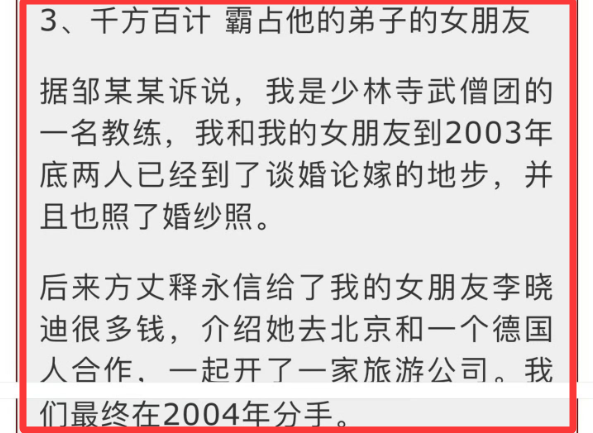 2003年前后,释永信还曾挖墙脚,抢走了少林寺武僧团一名教练的女朋友,引发不小争议。