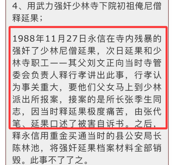 更有传言称,释永信早年曾使用残暴手段强奸寺内小尼姑,事后虽被报警,但事件被压下。