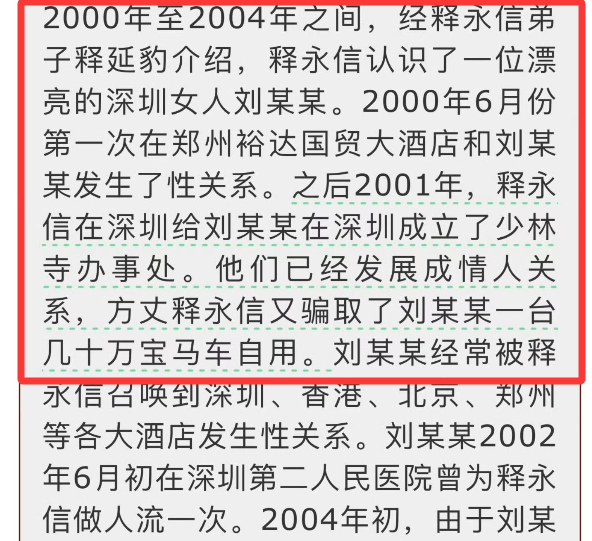 2004年,释永信又与深圳女子刘某某发生关系,事后反控女方敲诈勒索,引发舆论哗然。