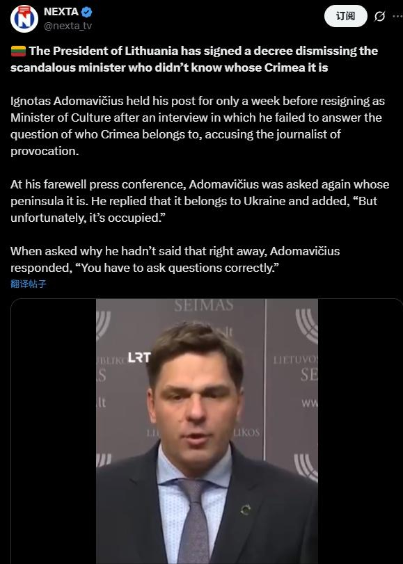 在其他消息方面,乌克兰驱逐舰前往美国进行改装,以适配1000英里射程的战斧巡航导弹发射。乌克兰指责大国向俄罗斯提供导弹攻击的卫星信息,但此事未获官方证实。立陶宛总统签署了一项法令,解雇了那位“不知道”克里米亚属于谁的部长——伊格诺塔斯·阿多马维丘斯。他担任文化部部长的职位仅维持了一周便辞职,原因是在一次采访中他未能回答“克里米亚属于谁”的问题,并指责记者是在挑衅。