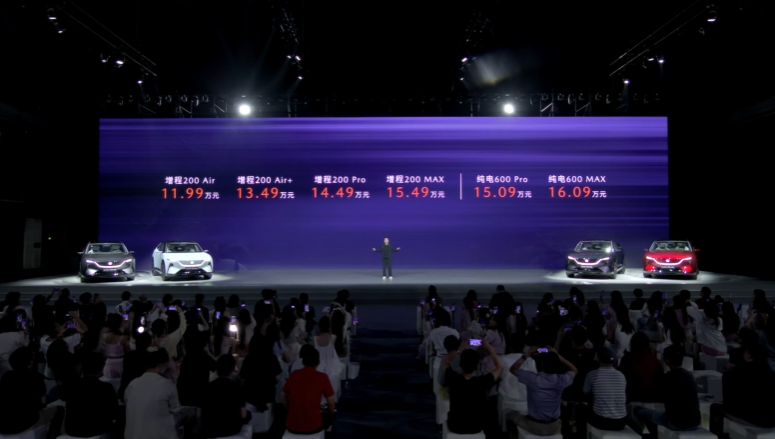 6 个配置实际上就 4 个,增程的 Pro 版和 Max 版与纯电的 Pro、Max 一一对应,各个版本的纯电续航也是一致的(增程 200km,纯电 600km),咱们看成 Air、Air+、Pro、Max 即可。