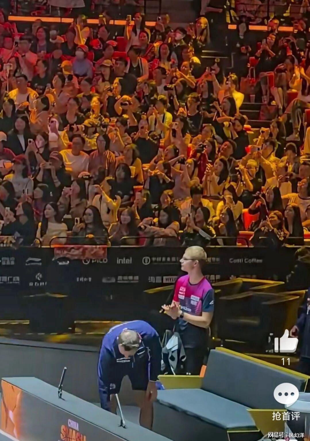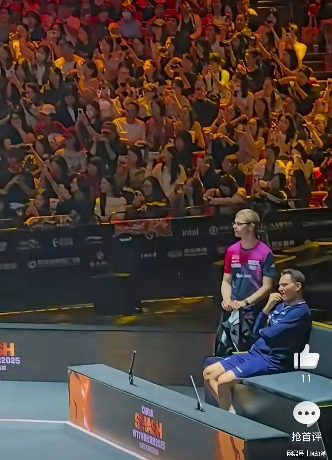 值得一提的是,比赛结束后的一幕让全场观众为之动容。当王楚钦在现场接受主持人采访时,小勒布伦和他的教练并未立即离场,而是始终站在场边认真聆听。直到采访结束,两人才开始收拾物品准备离开。