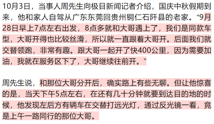 “我们都是广州车牌,还是同一款车型,出发地和目的地都很近,就是隔壁县城。从广东到贵州,这一路900公里,我们交替领航了四五百公里,真的非常有缘分。”周先生感慨地说。他还透露,10月3日,他专门开车近1个小时去见了袁先生,两人一起吃了饭,聊得非常开心。如果时间凑巧的话,他们还计划再约着一起回广东。