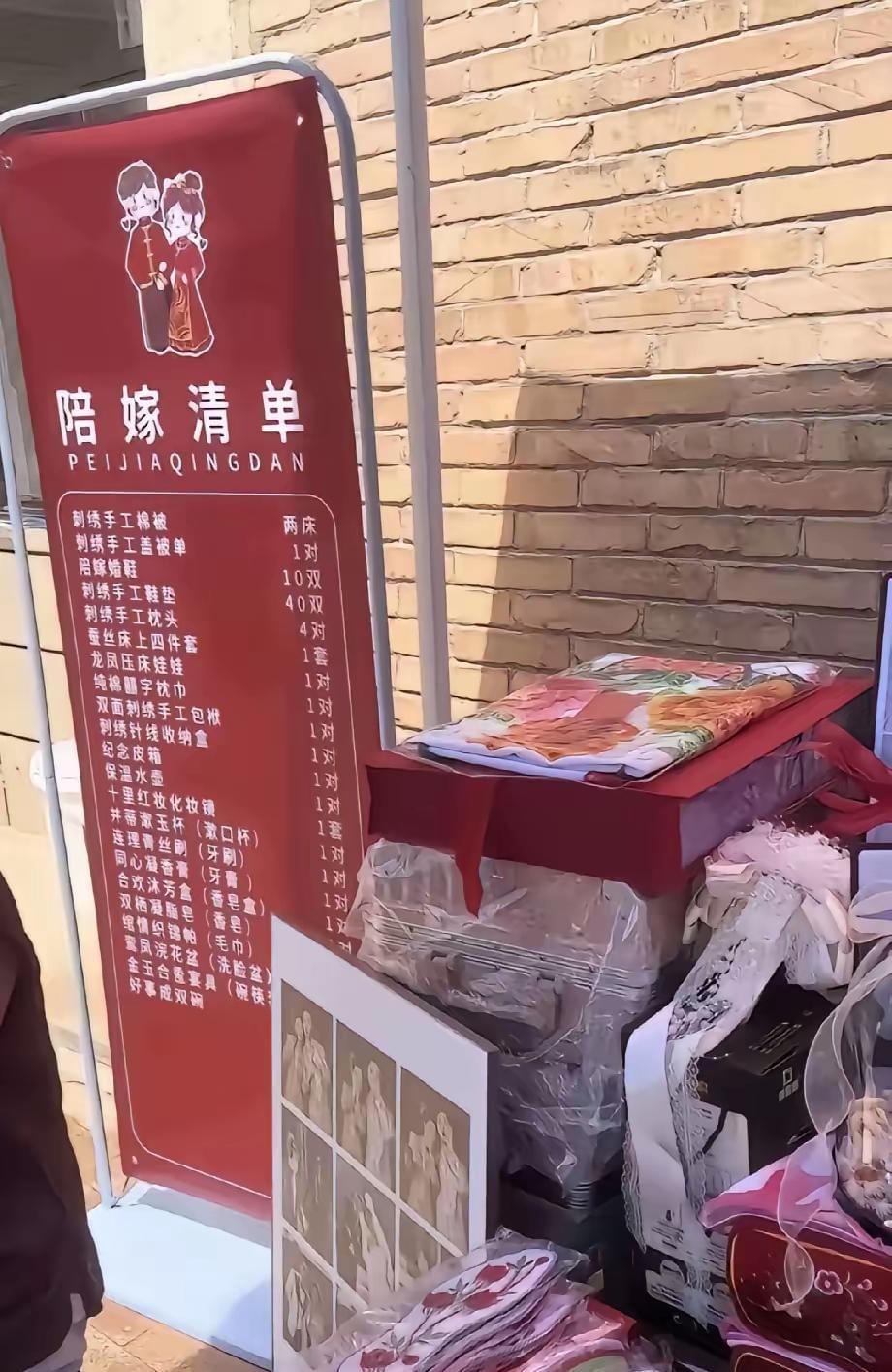 面对如此高昂的天价彩礼,不少人好奇,陪嫁应该也很丰厚吧?会不会有一套房子和一辆小车呢?然而,当嫁女儿的陪嫁清单曝光时,却令人大跌眼镜。清单上写着:刺绣手工棉被两床、手工盖被单一对、婚鞋10双、鞋垫40双、刺绣手工枕头4对、蚕丝床上四件套一套、龙凤压床娃娃一对、双面刺绣手工包袱一对、刺绣收纳盒一对、纪念皮箱一对、保温水壶一对、里红妆化妆镜一套、漱口杯一对、牙膏一对、香皂盒一堆、香皂一堆、毛巾一堆、洗脸盆碗筷等等。看到这份写得满满当当的易拉宝陪嫁清单,可这总价值应该不会超过1万,最值钱的就是一套蚕丝床上四件套。第一次听说还陪嫁鞋垫,现在还有人垫鞋垫吗?买来的鞋子里面不是都有鞋垫吗?