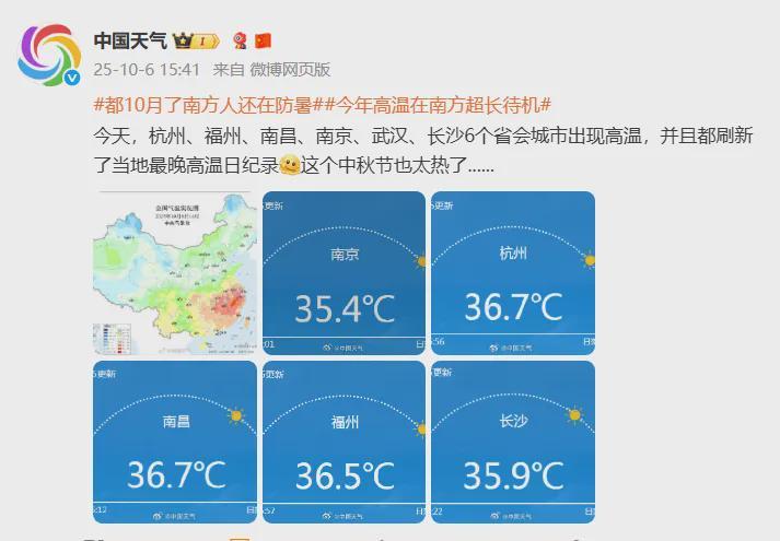 据@中国天气消息,今天,杭州、福州、南昌、南京、武汉、长沙这6个省会城市均出现了高温天气,并且这些城市都刷新了当地的最晚高温日纪录,这一现象引起了广泛关注。