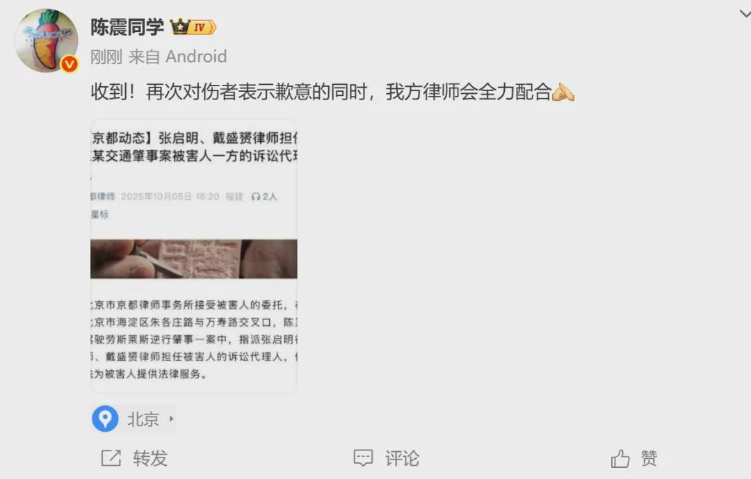 陈震发文回应:再次对伤者表示歉意的同时,我方律师会全力配合。