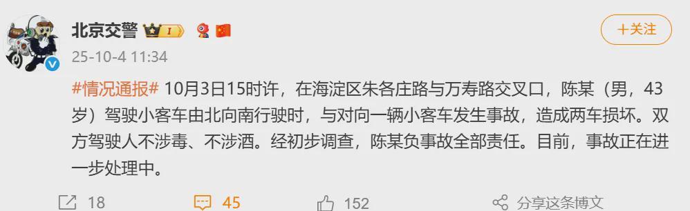 10月4日,北京交警发布通报:10月3日15时许,在海淀区朱各庄路与万寿路交叉口,陈某(男,43岁)驾驶小客车由北向南行驶时,与对向一辆小客车发生事故,造成两车损坏。双方驾驶人不涉毒、不涉酒。经初步调查,陈某负事故全部责任。目前,事故正在进一步处理中。