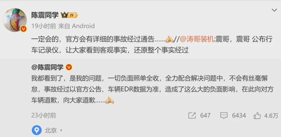 陈震发文回应:我都看到了,是我的问题,一切负面照单全收,全力配合解决问题中,不会有丝毫懈怠,事故经过以官方公告、车辆EDR数据为准,造成了这么大的负面影响,在此向对方车辆道歉,向大家道歉。