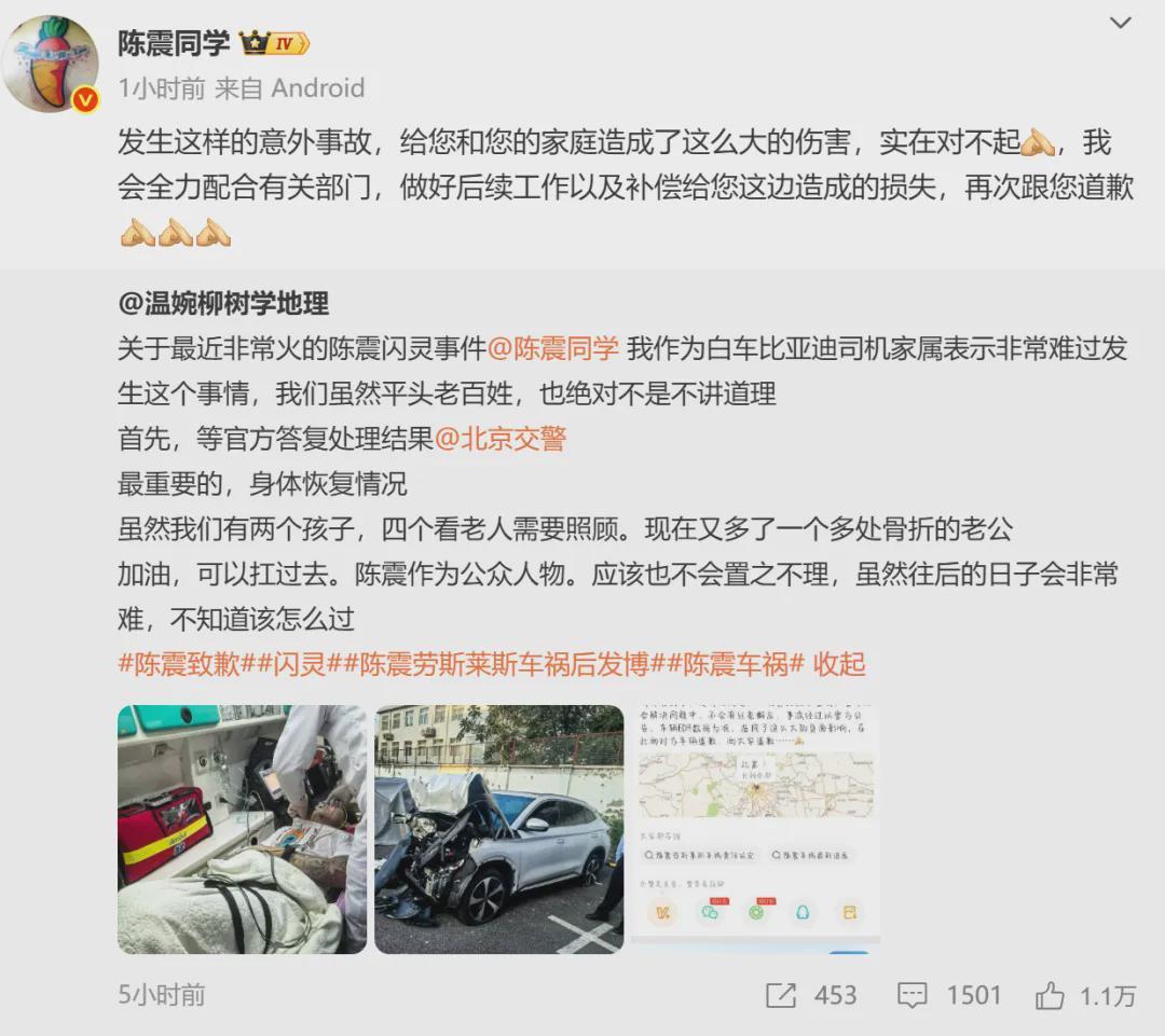 陈震转发贴文并道歉:发生这样的意外事故,给您和您的家庭造成了这么大的伤害,实在对不起,我会全力配合有关部门,做好后续工作以及补偿给您这边造成的损失,再次跟您道歉