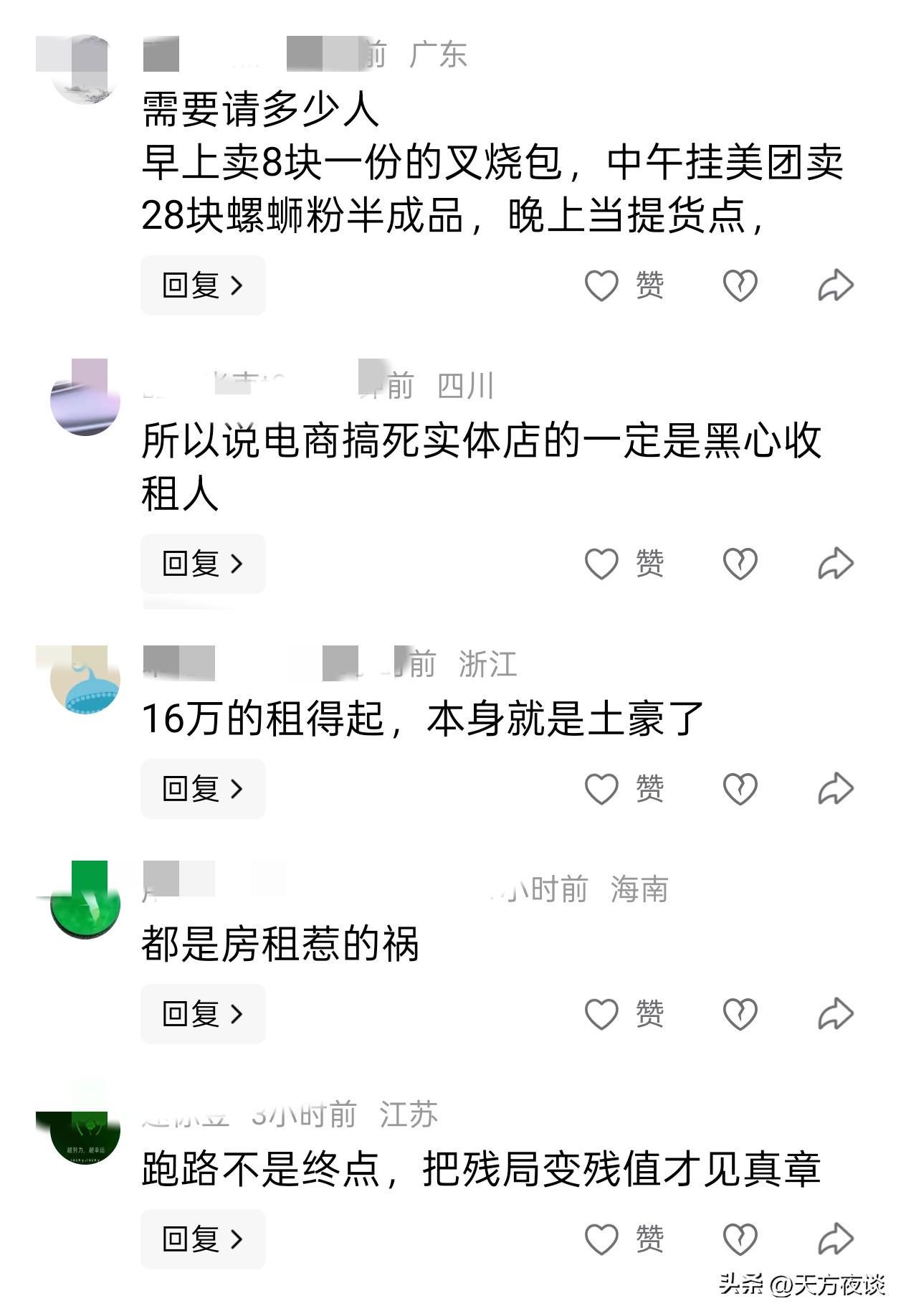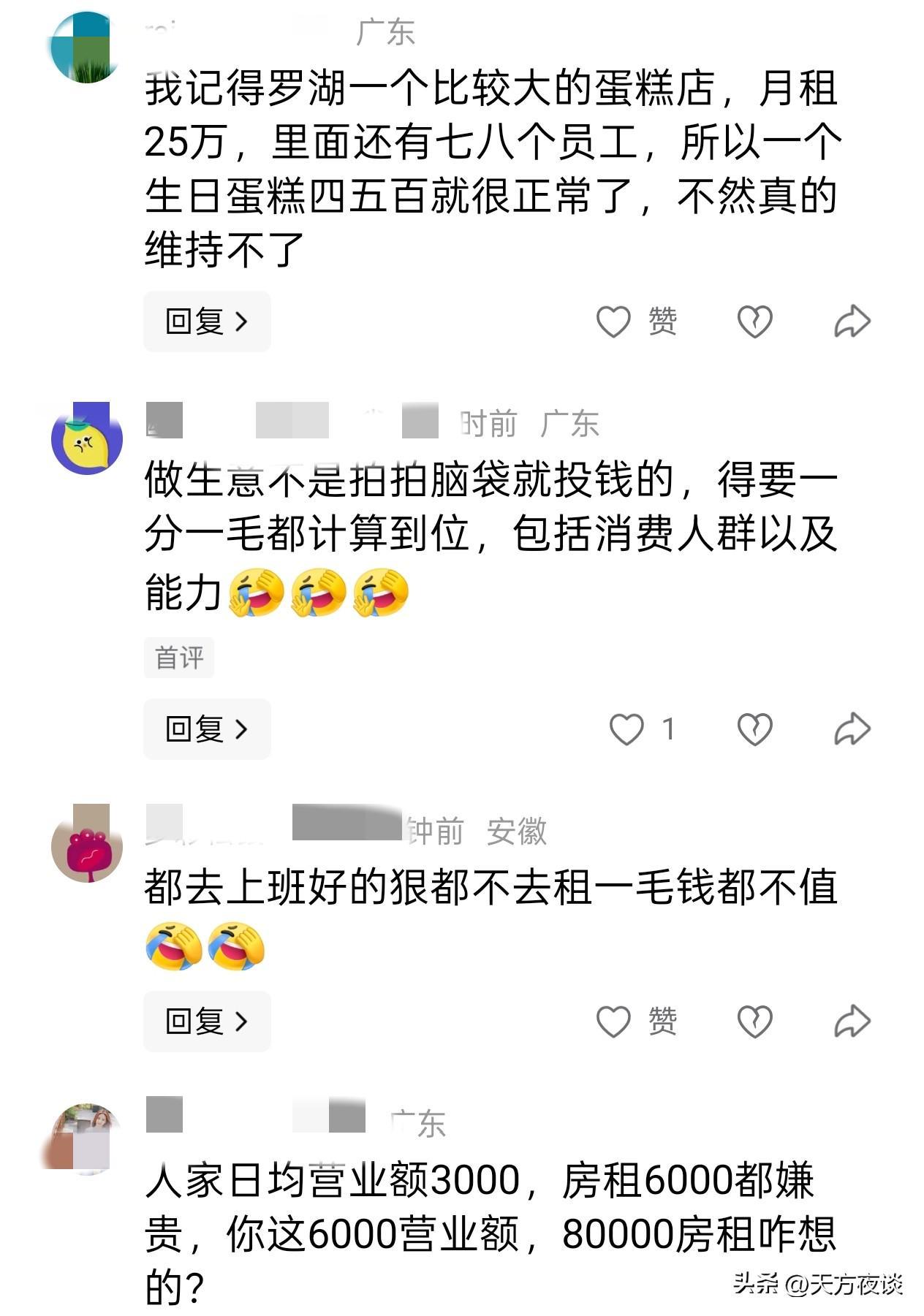 陈哥的事情也戳中了很多创业者的心。有人评论说:“我去年在福田开面馆,月亏8万元,押金没要到还倒贴了3万元。”也有人支招说:“退租前一定要存好合同、流水等证据,比吵架管用多了。”