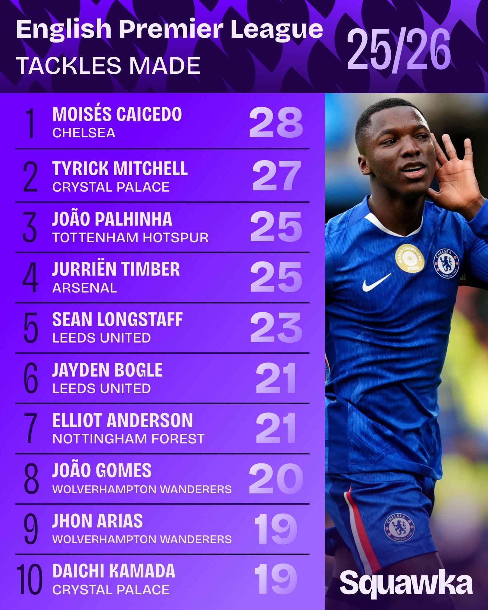 - 第1位:莫伊塞斯-凯塞多(切尔西)28次