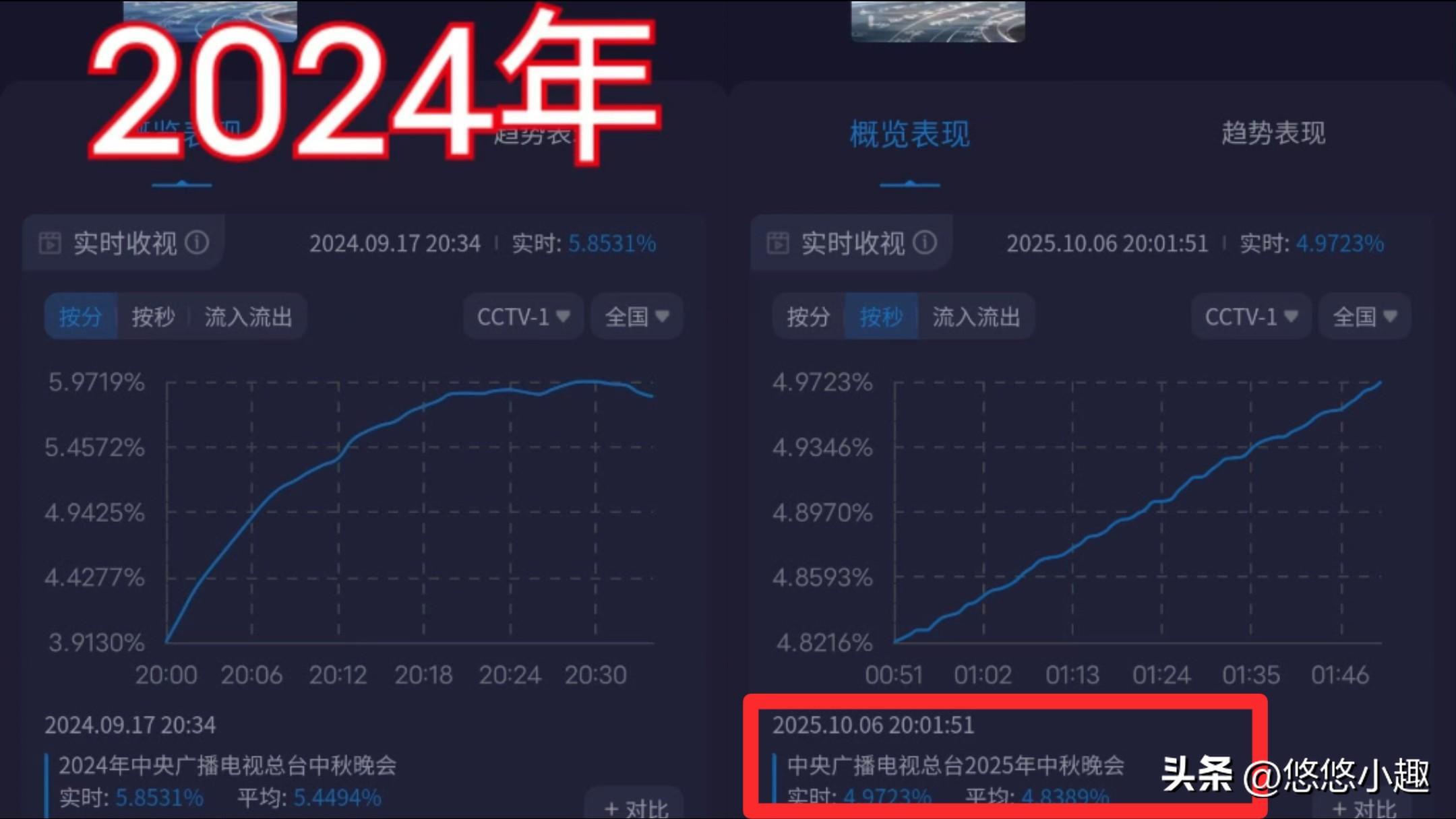 据不完全统计,央视中秋晚会开播仅半小时,收视率便已超越2024年中秋晚会的峰值。截至开播半小时,收视率已突破7,而2024年最高收视率仅约6。这些数据充分展现了观众对本次晚会的期待与关注。