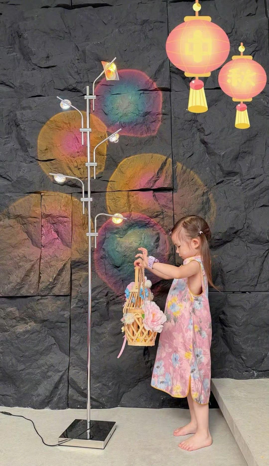 而两人的女儿小蛋饺,则成为了这组照片的焦点。她穿着粉色旗袍出镜,身材纤瘦,头发浓密,小腿笔直细长,十分抢镜。在一张照片中,小蛋饺坐在父母中间,眼睛上戴着粉色爱心眼镜,双手比耶嘟起小嘴巴,模样非常可爱。