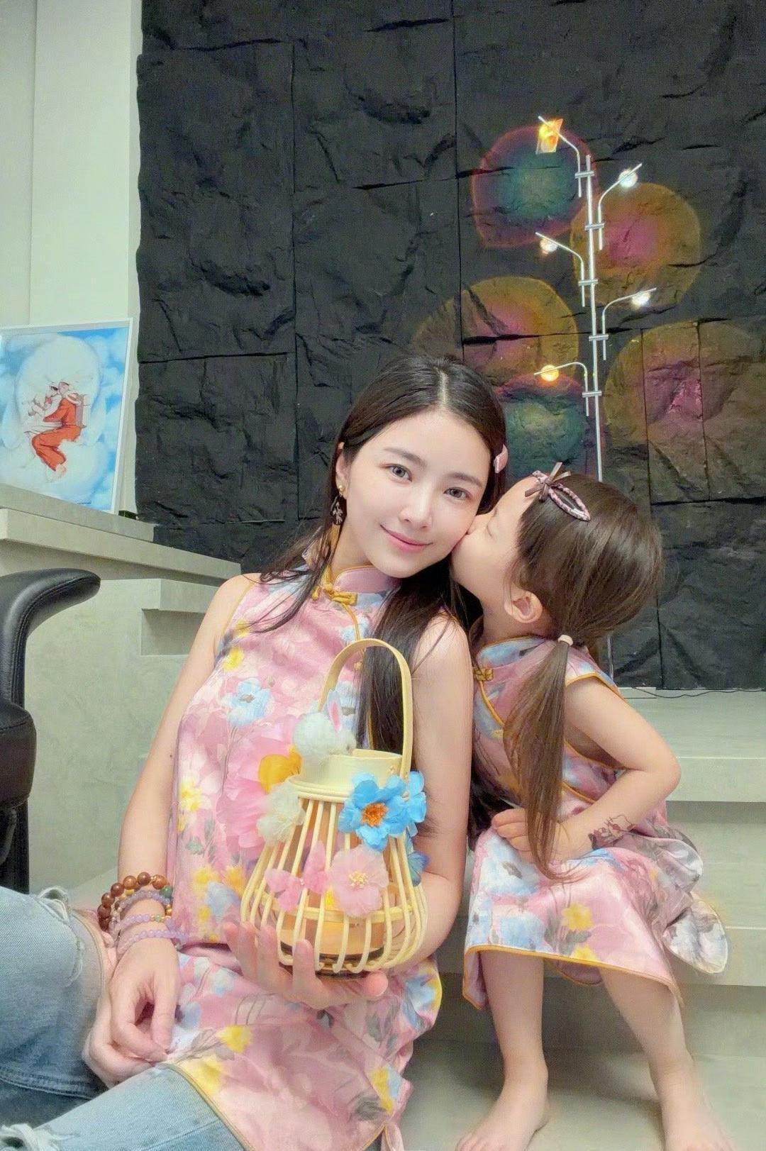 母女俩的合照自然也少不了。王灿这次同样换上和女儿同款旗袍,靠在身后的台阶处,女儿坐在台阶上,歪着小脑袋亲吻她的脸颊。画面温馨有爱,让人感受到母女之间的深厚感情。
