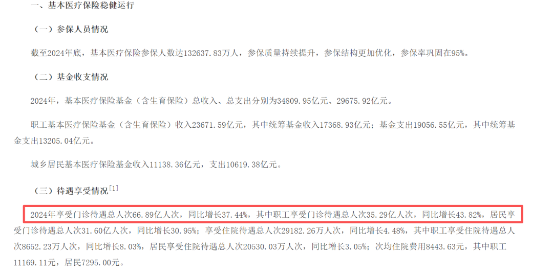 然而,另一个问题也随之而来。部分医院为了控制住院的成本,选择将一些在住院期间完成的检查、康复治疗等挪到门诊去完成,进而导致门诊的医疗费用飙升。根据数据统计,2024年全国医保门诊报销总人次达66.89亿人次,同比增长37.44%,其中门诊次均费用已接近400元,总支出规模持续扩大。