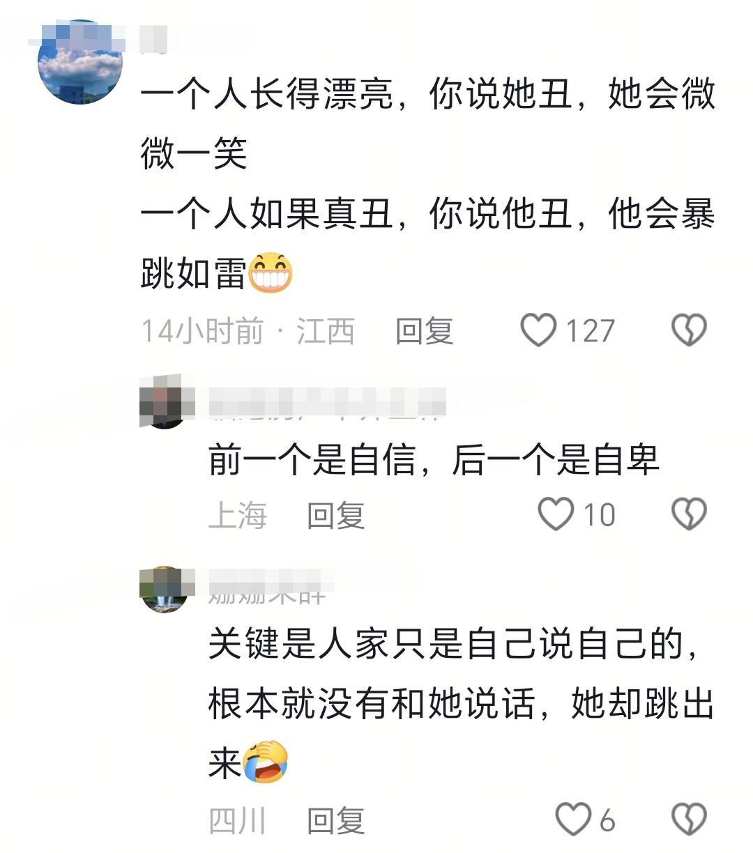 还有网友分析道:‘一个人长得漂亮,你说她丑,她会微微一笑;一个人如果真丑,你说他丑,他会暴跳如雷!’这话听起来似乎很有道理,反映了丑和美的巨大反差。