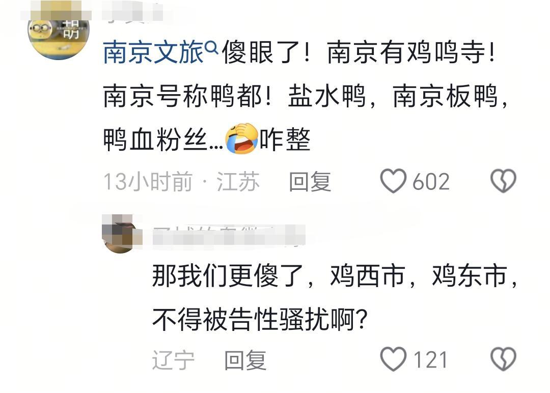 此事一出,网友们纷纷表示无语。有网友调侃道:‘带鸡字的都不能叫了吗?不光南京有鸡鸣寺,陕西还有宝鸡,辽宁有鸡西、鸡东,难道都要改名字吗?’