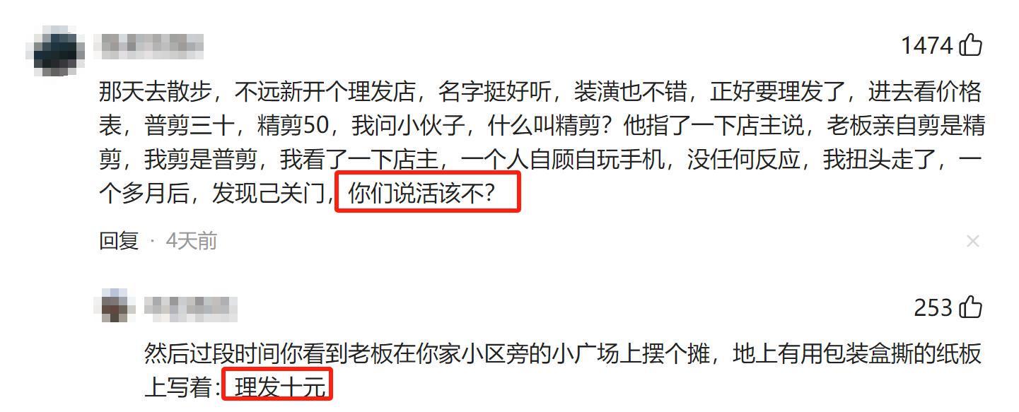他指了一下店主说,老板亲自剪是精剪,我剪是普剪,我看了一下店主,一个人自顾自玩手机,没任何反应,我扭头走了,一个多月后,发现己关门,你们说活该不?