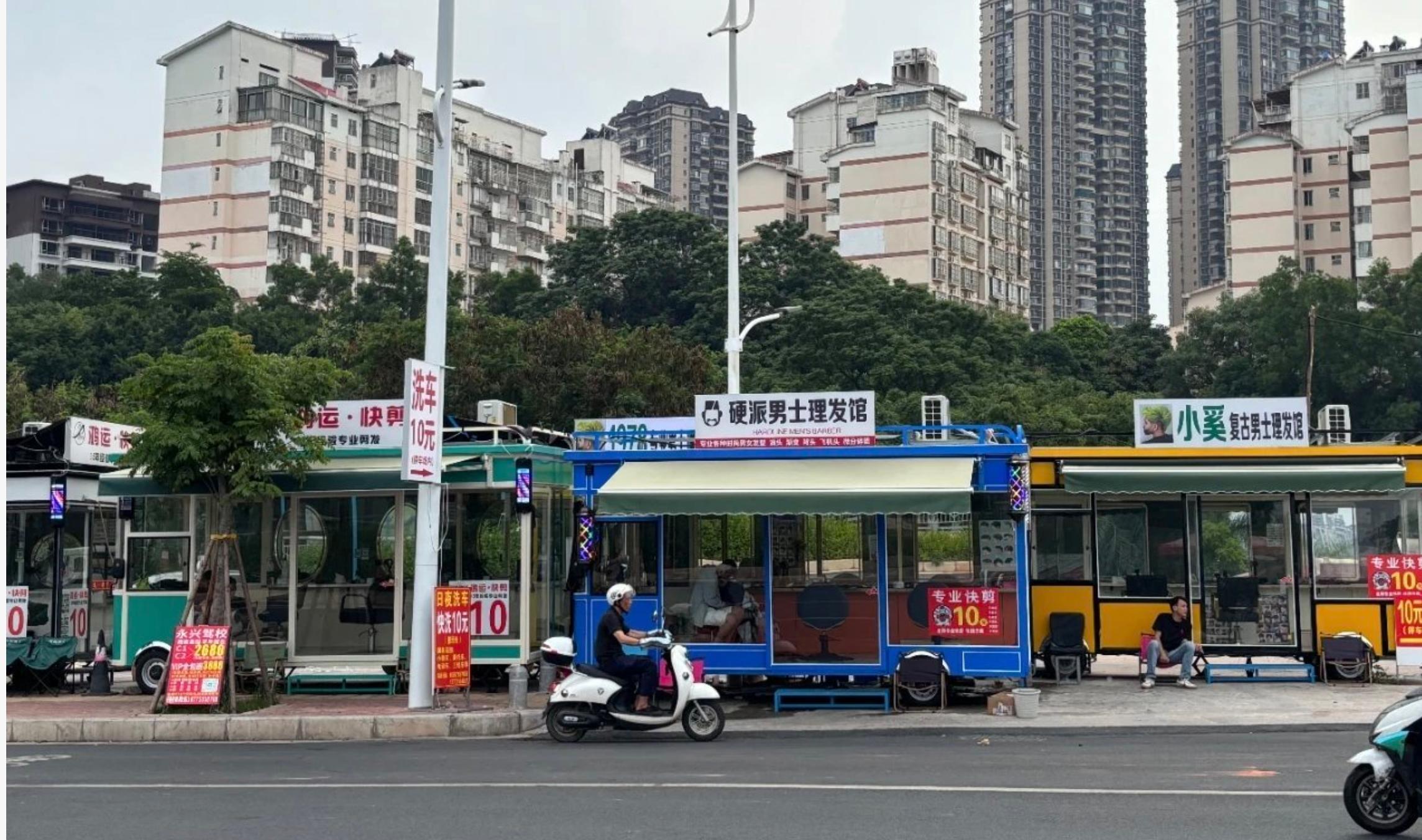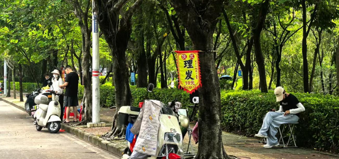 “10元理发”在很多城市的街边、桥洞、公园兴起,招牌很简单,有的是一面旗子,有的是一张纸质广告牌,简单明了。