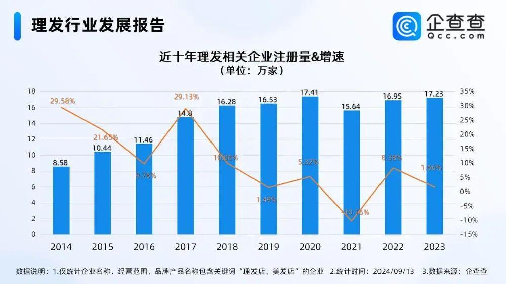 据企查查数据显示,2014年有关理发的企业注册数量仅为8.58万家,但到了2020年,这个数量飙升至了17.41万家。