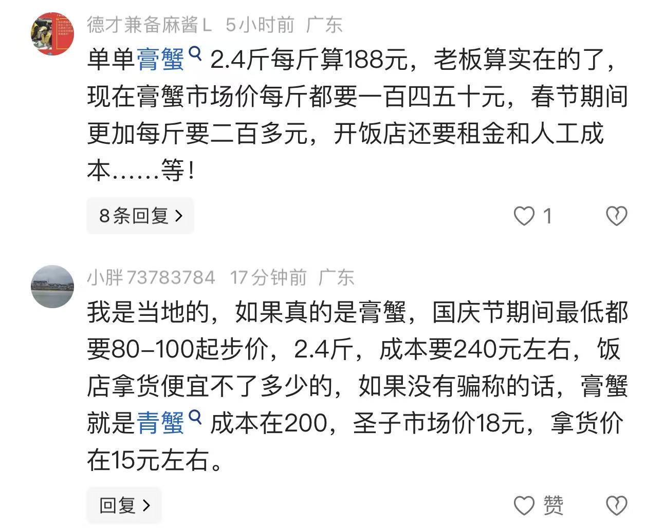 随着事件发酵,评论区出现了不同声音。部分广东网友为商家发声,认为膏蟹价格合理,商家并未坑客。这一观点也引发了更多关于海鲜定价的讨论。