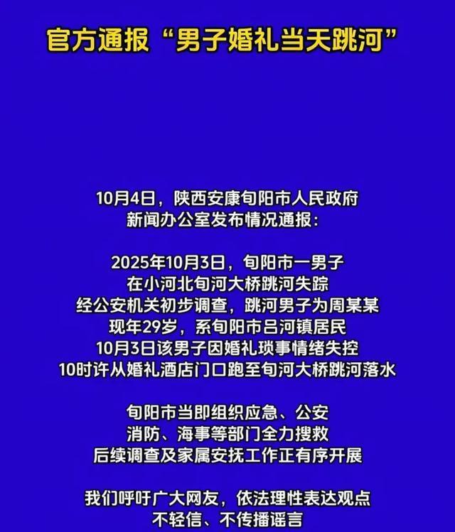 搜救队夜里收工时,队长跟记者说:“水流太急,可能冲到丹江口水库了。”翻译成人话就是:捞着算奇迹,捞不着算常态。第二天,太阳照常升起,旬河照样流,银行照样扣款,酒店照样接婚宴。只是少了一个31岁的新郎,多了一张16.8万的欠条,贴在河面上,随风飘,像一张没写完的喜帖,诉说着无尽的哀伤与无奈。