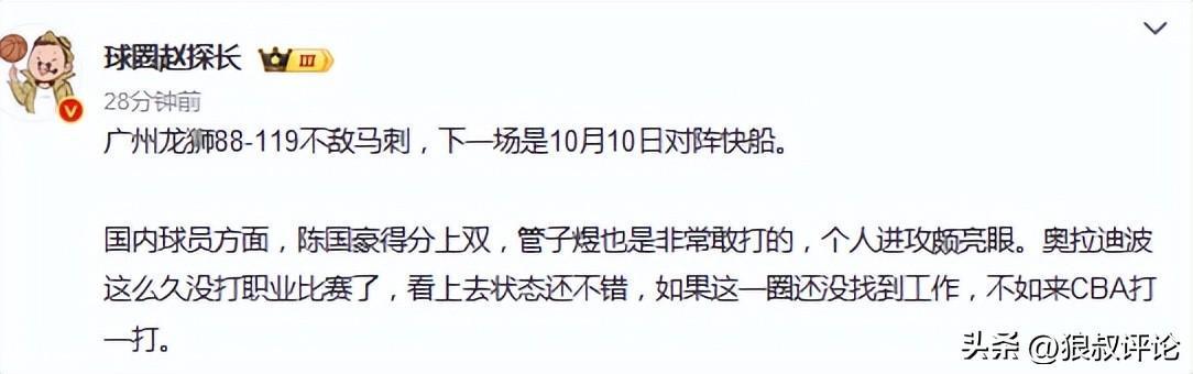 赛后媒体人赵探长发文点评道:“奥拉迪波这么久没打职业比赛了,看上去状态还不错,如果这一圈还没找到工作,不如来CBA打一打。”这一建议迅速引发球迷讨论,毕竟以奥拉迪波目前的竞技状态,完全有能力在CBA联赛中担任核心外援。