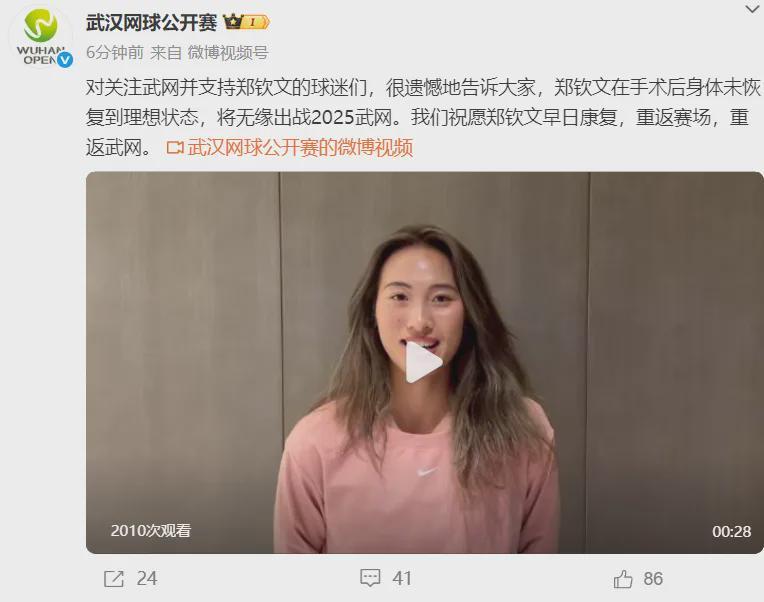 然而,此前有消息称,10月3日,@武汉网球公开赛 官方发布消息,对一直关注武网并支持郑钦文的球迷们表示遗憾:由于郑钦文在手术后身体未能恢复到理想状态,她将无法出战2025武网。我们衷心祝愿郑钦文能够早日康复,重返赛场,再次在武网的舞台上展现风采。