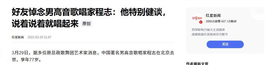 2023年3月29日,程志老师因直肠癌在北京去世,享年77岁。