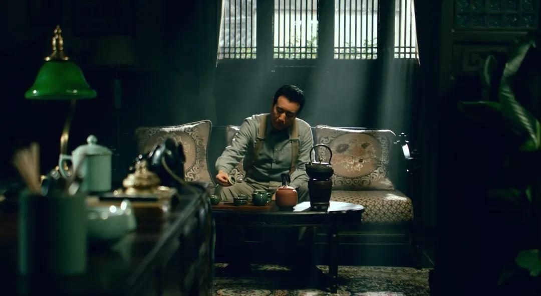 在聂曦突然现身三荣行取情报的一场戏中,他站在柜台后目光如炬,表面整理账册,实则高度戒备。